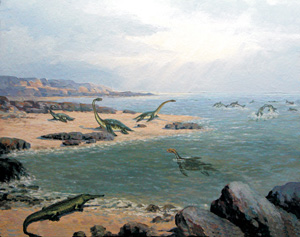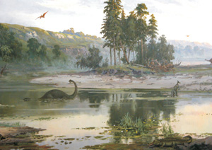 Мезозойська ера продовжувалася приблизно 185 млн років. Її підрозділяють на тріасовий, юрський та крейдовий періоди, з яких найдовшим був останній (тривав близько 80 млн років). Початок цієї ери збігається з кінцем варисцийських горотворчих процесів, а кінець — з початком альпійської складчастості. У біологічному плані мезозойська ера, яку називають ерою рептилій, була часом переходу від старих, примітивних, до нових, прогресивних форм життя. Фауна і флора мезозою виступають у дуже оновленому складі. Глобальна катастрофа, що сталася 251 млн років тому, на межі між пермським та тріасовим періодами, знищила близько 90% палеозойських видів. Незважаючи на це, за дуже короткий час рослинний і тваринний світ мезозою став значно багатшим і різноманітнішим за палеозойський. Вітрина 33. В тріасовому періоді суша розділяється на два континенти — Лавразію у північній півкулі та Гондвану на півдні. Западина між ними була заповнена океаном, що має назву Тетис. Скорочується площа морських басейнів. На суходолі розвиваються відкриті простори, подібні до степів, саван та пустель. У морях та прісноводних водоймах відбувається розквіт сифонеїв — харових водоростей (Charophita), рештки яких відіграють важливу роль у стратиграфії тріасу. Аридизація клімату призвела до вимирання багатьох плауноподібних та папоротеподібних, але надало величезну перевагу насінним рослинам. До найбільш численних і цікавих голонасінних початку мезозойської ери належать цикадові (Cycas) або сагові. Зовні вони походили на деревоподібні папороті та пальми — верхівки їхніх стебел прикрашало довге пір'ясте листя (наприклад, рід Pterophyllum). Крім цикадових, велике поширення одержали беннеттитові (Bennettitales). В цілому вони нагадують справжніх цикадових, але їхнє насіння починає здобувати міцну оболонку, що надає беннеттитовим подібності з покритонасінними. Є й інші ознаки їхньої адаптації до умов більш посушливого клімату. В цей час швидко розселяються хвойні і серед них ялиці, кипариси, тиси. З числа гінкгових широке поширення одержав рід Baiera. Листя цих рослин мало форму віялоподібних пластинок, глибоко розсічених на вузькі смуги. Папороті (Hausmannia та інші Dірtеrіdасеа) захопили вологі тінисті місця по берегах невеликих водойм, але серед них відомі і форми, що росли на скелях (Gleicheniacae). По болотах зростали хвощі (Equisetites, Phyllotheca, Schizoneura), які, однак, не досягали розмірів своїх палеозойських предків. Вітрина 34. Світ найпростіших тріасу був надзвичайно різноманітним. Безхребетні вже були близькими до сучасних — вапнякові губки, моховатки, брахіоподи, листоногі раки (Phyllopoda) з гнатостраків (Gnathostraca) та остракоди (Ostracoda). На зміну палеозойським табулятам і чотирьохпроменевим коралам приходять шестипроменеві корали (Hexacoralla), колонії яких стали головними рифоутворювачами. Помітне місце у морях займали головоногі молюски-амоніти (Ammonitida) — з 52 відомих родин амонітів в тріасі існувала майже половина. Ці тварини водилися у такій величезній кількості, що їхні черепашки зустрічаються практично в усіх морських відкладах цього часу. Вони з'явилися ще в силурі і пережили свій перший розквіт в девоні, але найвищого різноманіття досягли у мезозої — лише в тріасі виникло понад 400 нових родів амонітів. Особливо характерними для тріасу були цератитиди (Ceratitida). До кінця цього періоду більшість древніх груп амон